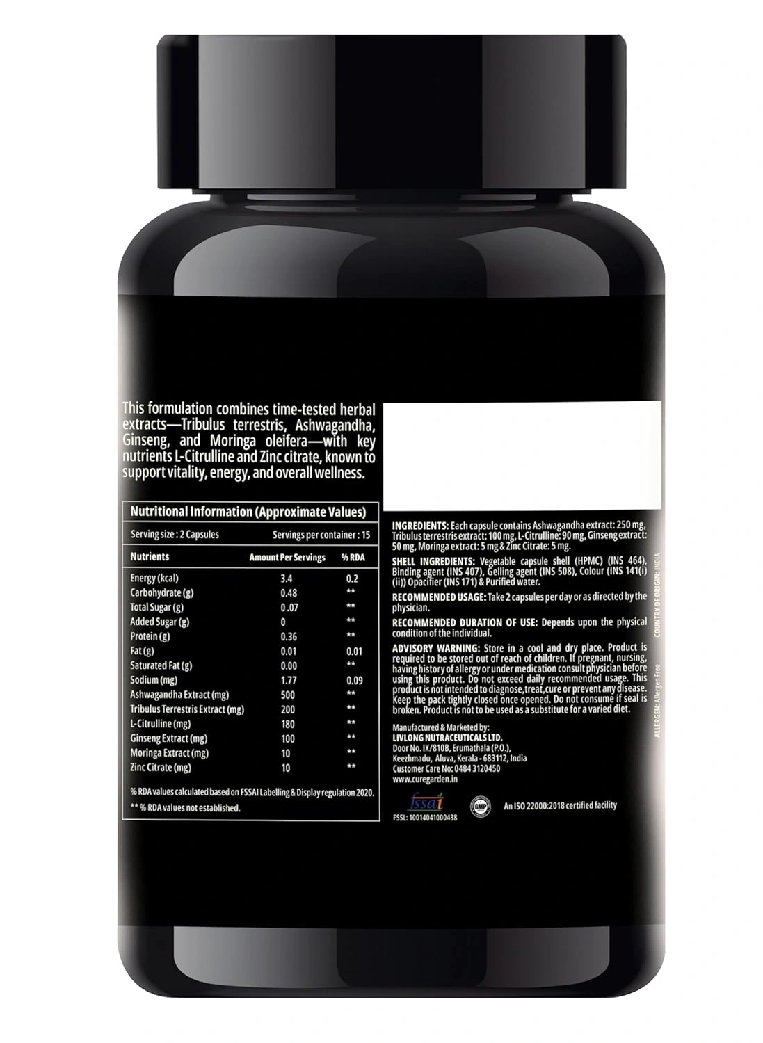 Curegarden Alphamight is a thoughtfully crafted daily wellness supplement designed to support energy, stamina, strength and stress balance using a blend of time-tested herbal extracts and essential nutrients. Each vegetarian capsule combines tribulus terrestris extract, ashwagandha extract, ginseng extract, moringa oleifera extract, L-citrulline and zinc citrate to deliver comprehensive nutritional support for active and wellness-focused individuals. Adaptogenic herbs such as ashwagandha and ginseng are traditionally valued for helping the body adapt to everyday stress and maintain balance during physically and mentally demanding routines. Tribulus and moringa contribute to overall vitality and nutritional intake, while L-citrulline supports natural energy pathways associated with physical activity. Zinc, an essential mineral, plays an important role in normal metabolic function and daily nutritional adequacy. Alphamight is designed for individuals seeking a clean, plant-based supplement to complement workouts, busy schedules or general wellness goals. The vegetarian capsules are easy to consume and suitable for regular daily use when paired with a balanced diet, proper hydration and an active lifestyle.