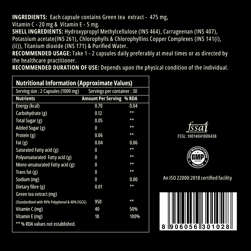 - SUPER ANTIOXIDANT PROPERTIES: Polyphenols active in green tea extract are known to possess excellent antioxidant benefits and also helps protect the cardiovascular system. Vitamin E & C enhances the antioxidant properties of green tea extract.