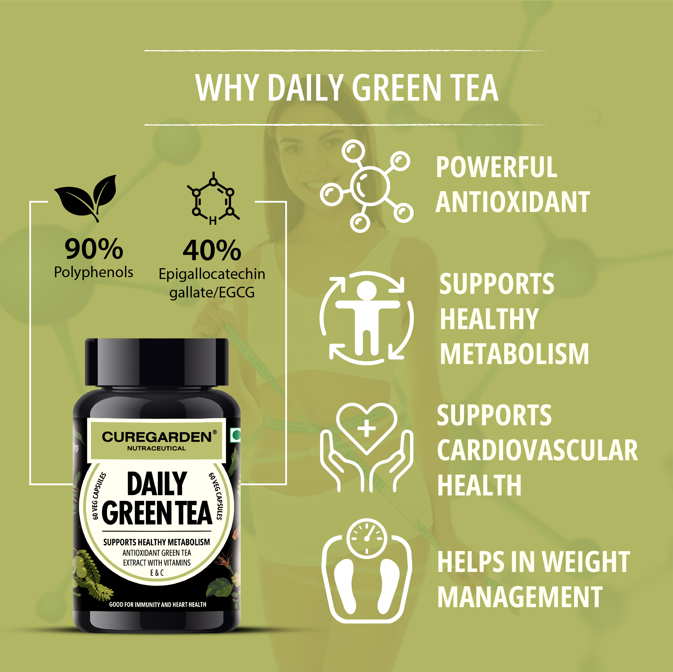 Daily GreenĀ Tea capsule contains a greenĀ teaĀ blend (with 90% Polyphenols and 40 % epigallocatechin gallate/ EGCG) that is good for energy and supports immunity
