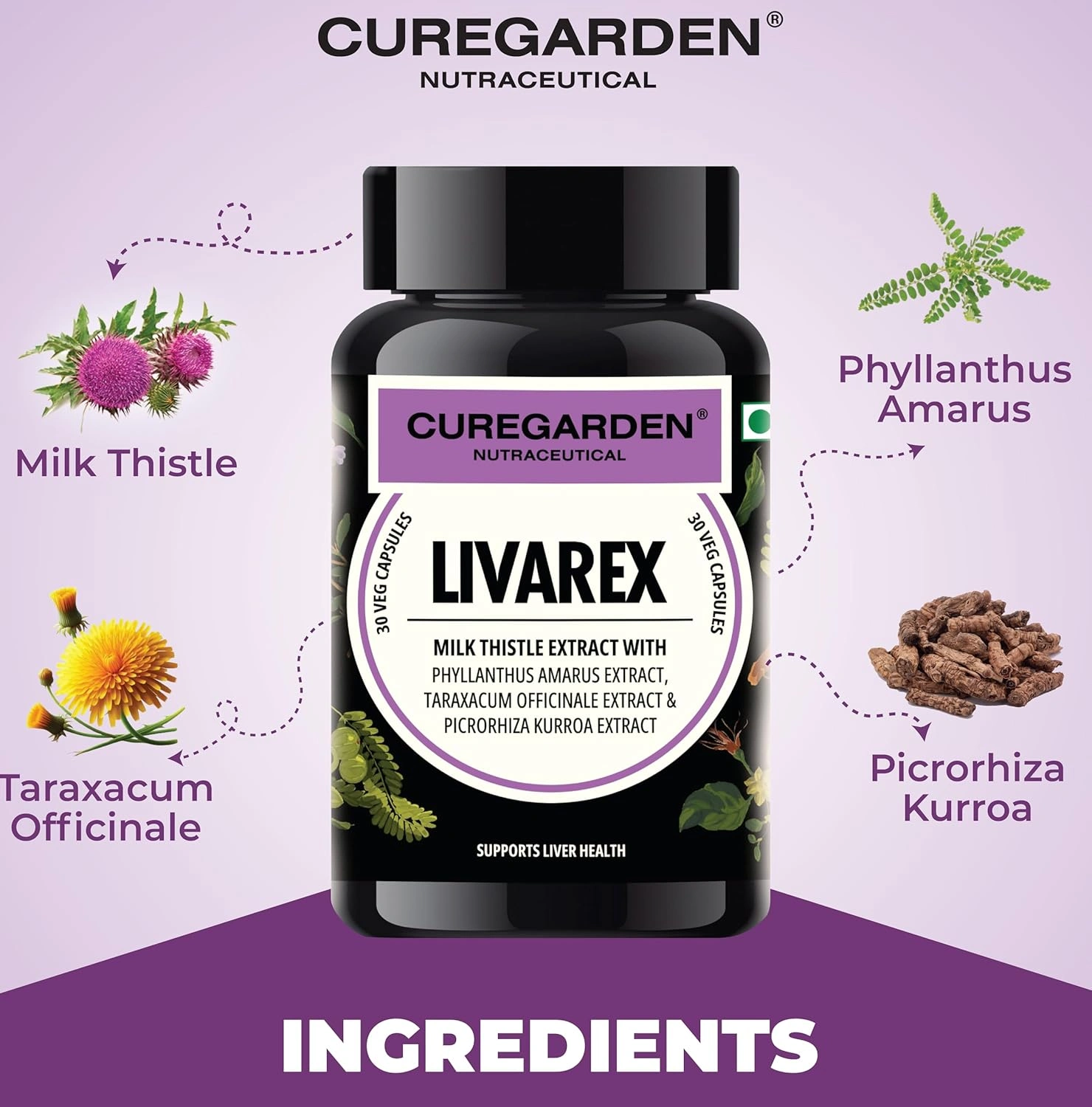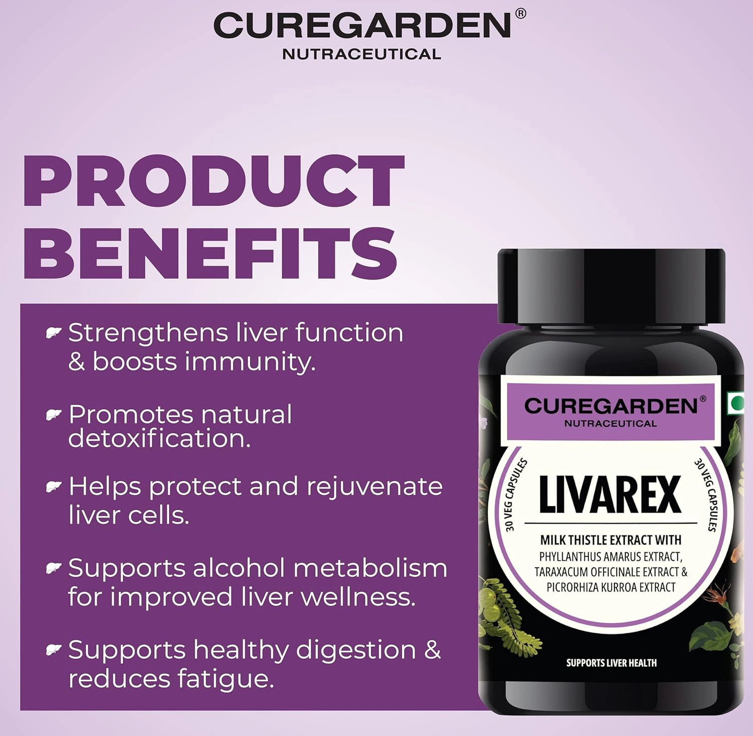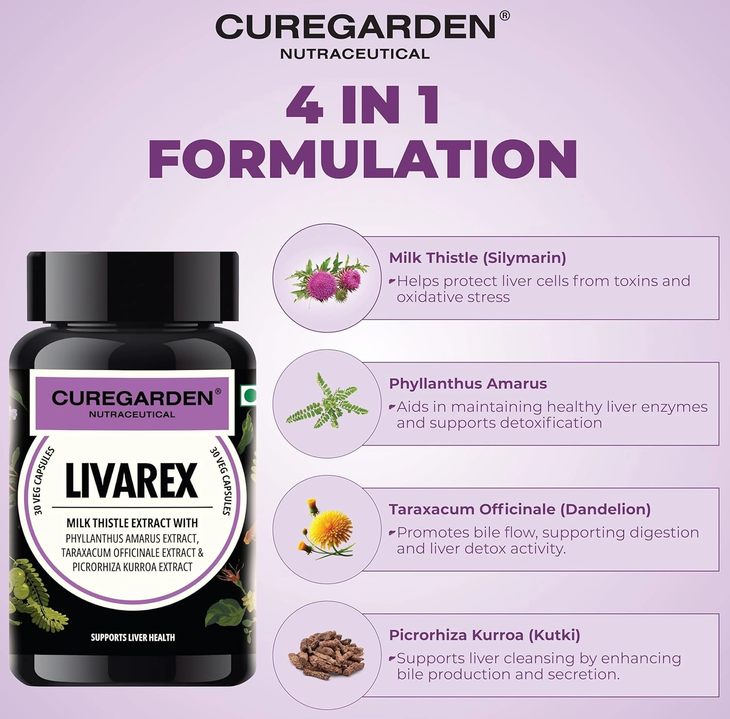 Curegarden Livarex is a carefully crafted herbal wellness supplement designed to support daily liver health and overall internal balance using a blend of traditionally used plant extracts. Each vegetarian capsule contains milk thistle extract, phyllanthus amarus extract, dandelion (taraxacum officinale) extract, and kutki (picrorhiza kurroa) extractābotanicals long valued in traditional wellness practices for their role in supporting normal liver function and digestive comfort. The liver plays an essential role in everyday metabolic processes, and maintaining its normal function is an important part of long-term wellness. Livarex is intended to complement a balanced diet and healthy lifestyle by providing plant-based nutritional support without harsh additives or synthetic ingredients. Milk thistle is widely recognized for its antioxidant-rich profile, while phyllanthus, dandelion, and kutki are traditionally included in herbal formulations focused on internal balance and digestive ease. The vegetarian capsules are easy to incorporate into daily routines and suitable for individuals preferring herbal-based supplements as part of a mindful approach to wellness. Livarex can be used alongside a regular diet, proper hydration and an active lifestyle.