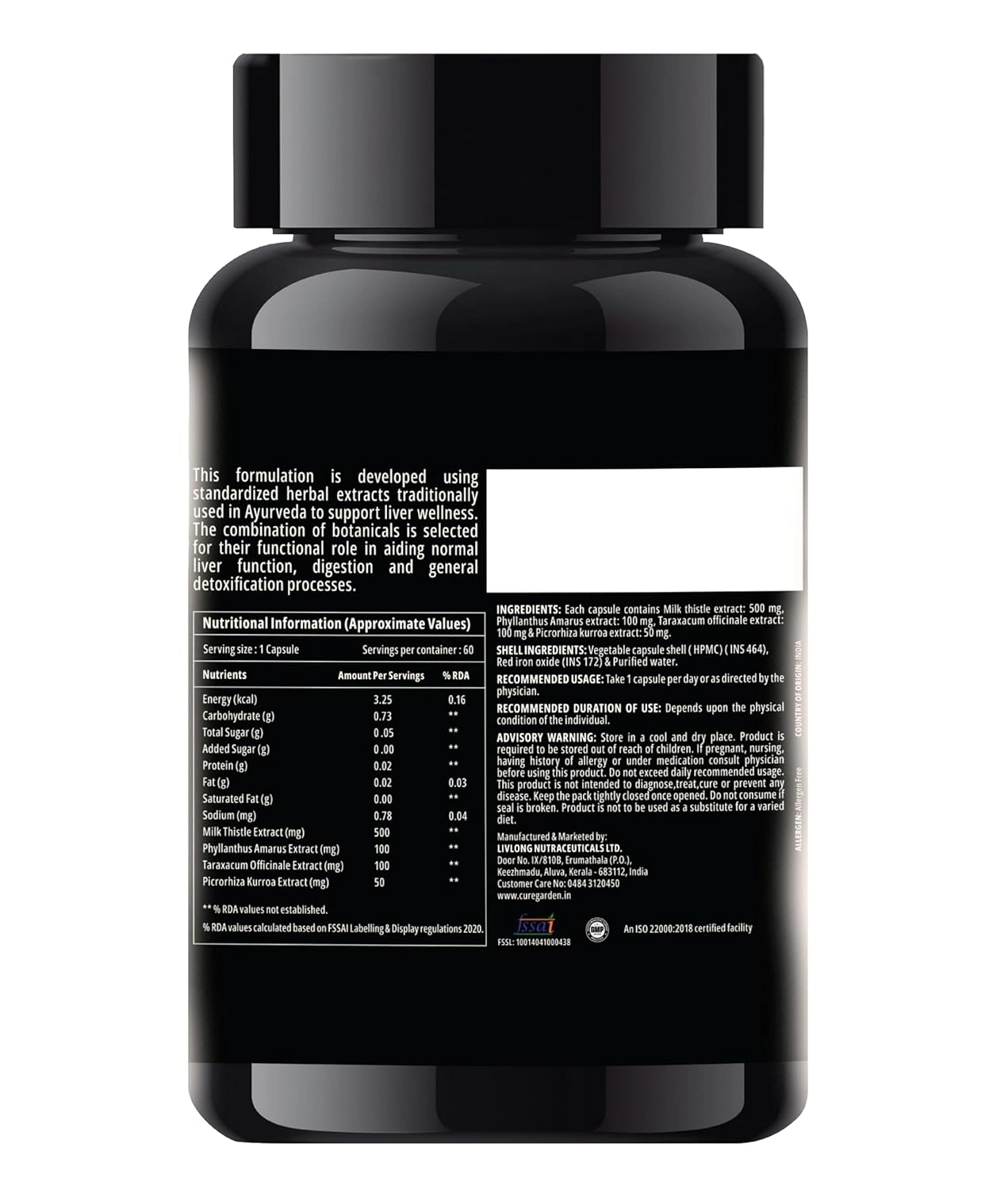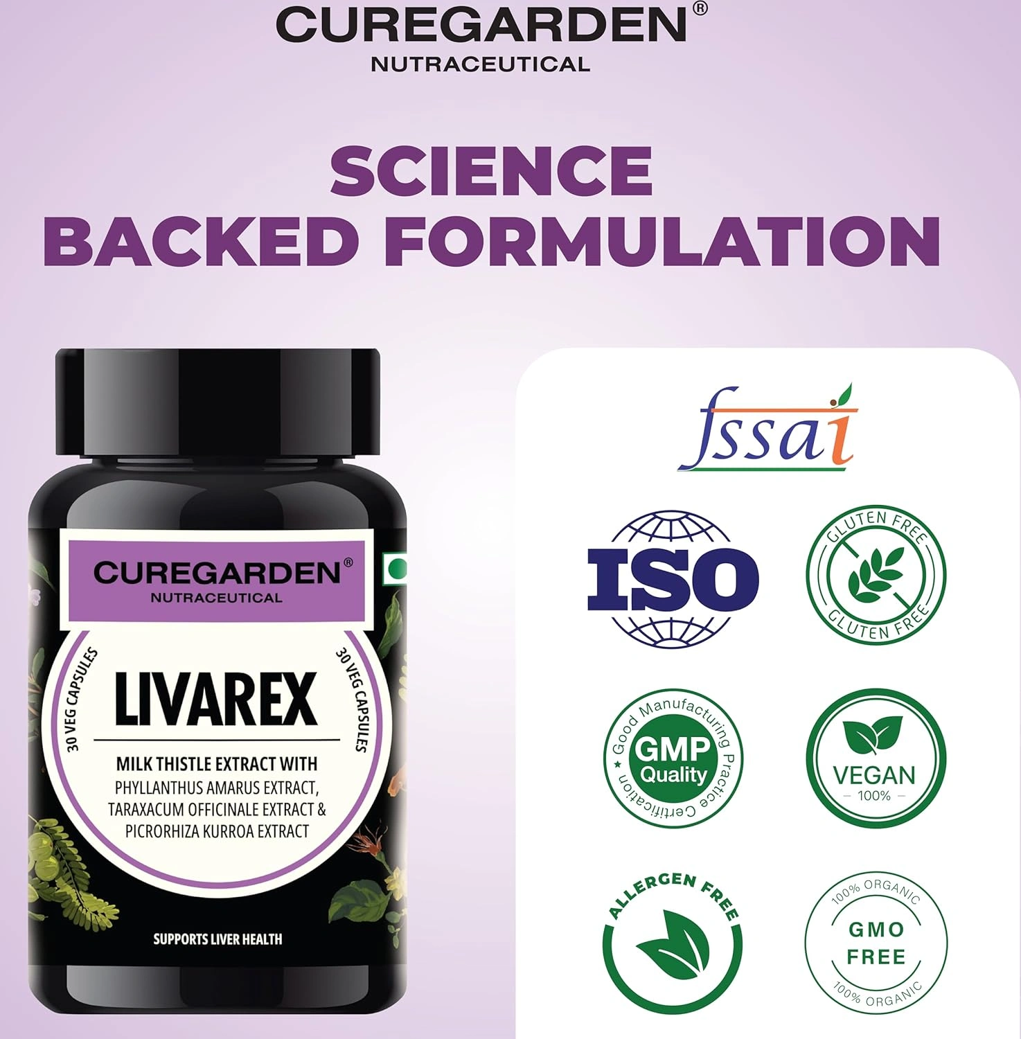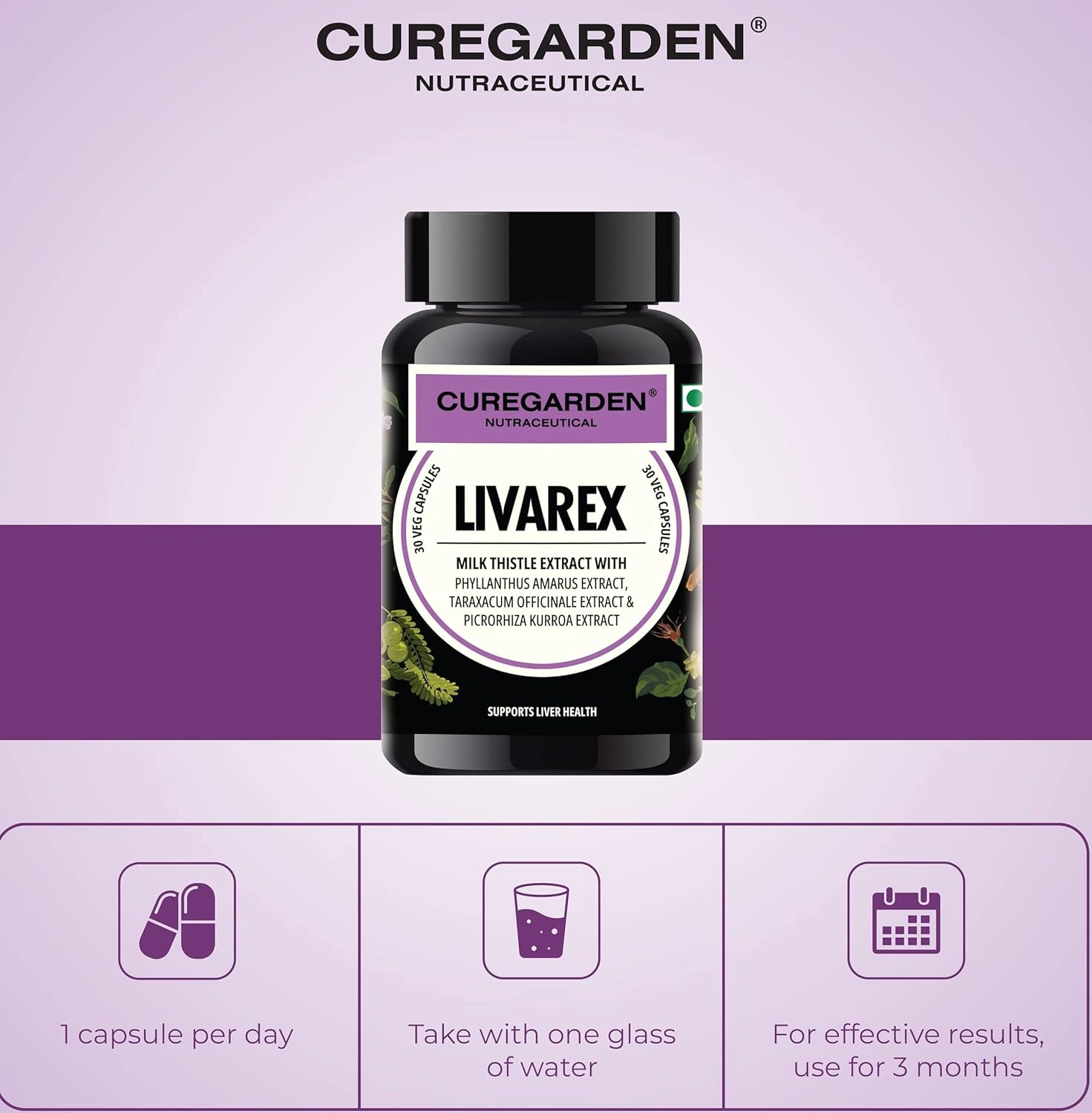 Curegarden Livarex is a carefully crafted herbal wellness supplement designed to support daily liver health and overall internal balance using a blend of traditionally used plant extracts. Each vegetarian capsule contains milk thistle extract, phyllanthus amarus extract, dandelion (taraxacum officinale) extract, and kutki (picrorhiza kurroa) extractābotanicals long valued in traditional wellness practices for their role in supporting normal liver function and digestive comfort. The liver plays an essential role in everyday metabolic processes, and maintaining its normal function is an important part of long-term wellness. Livarex is intended to complement a balanced diet and healthy lifestyle by providing plant-based nutritional support without harsh additives or synthetic ingredients. Milk thistle is widely recognized for its antioxidant-rich profile, while phyllanthus, dandelion, and kutki are traditionally included in herbal formulations focused on internal balance and digestive ease. The vegetarian capsules are easy to incorporate into daily routines and suitable for individuals preferring herbal-based supplements as part of a mindful approach to wellness. Livarex can be used alongside a regular diet, proper hydration and an active lifestyle.