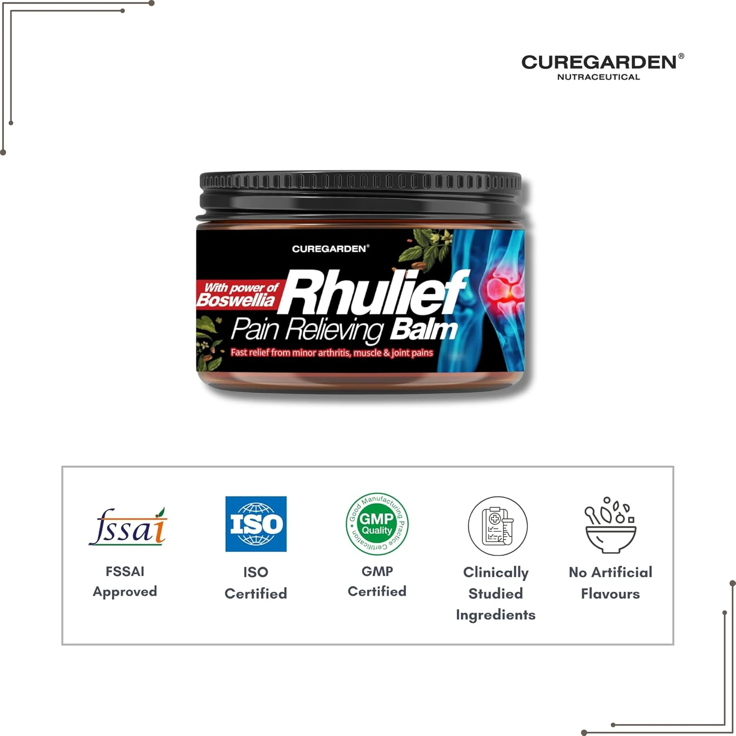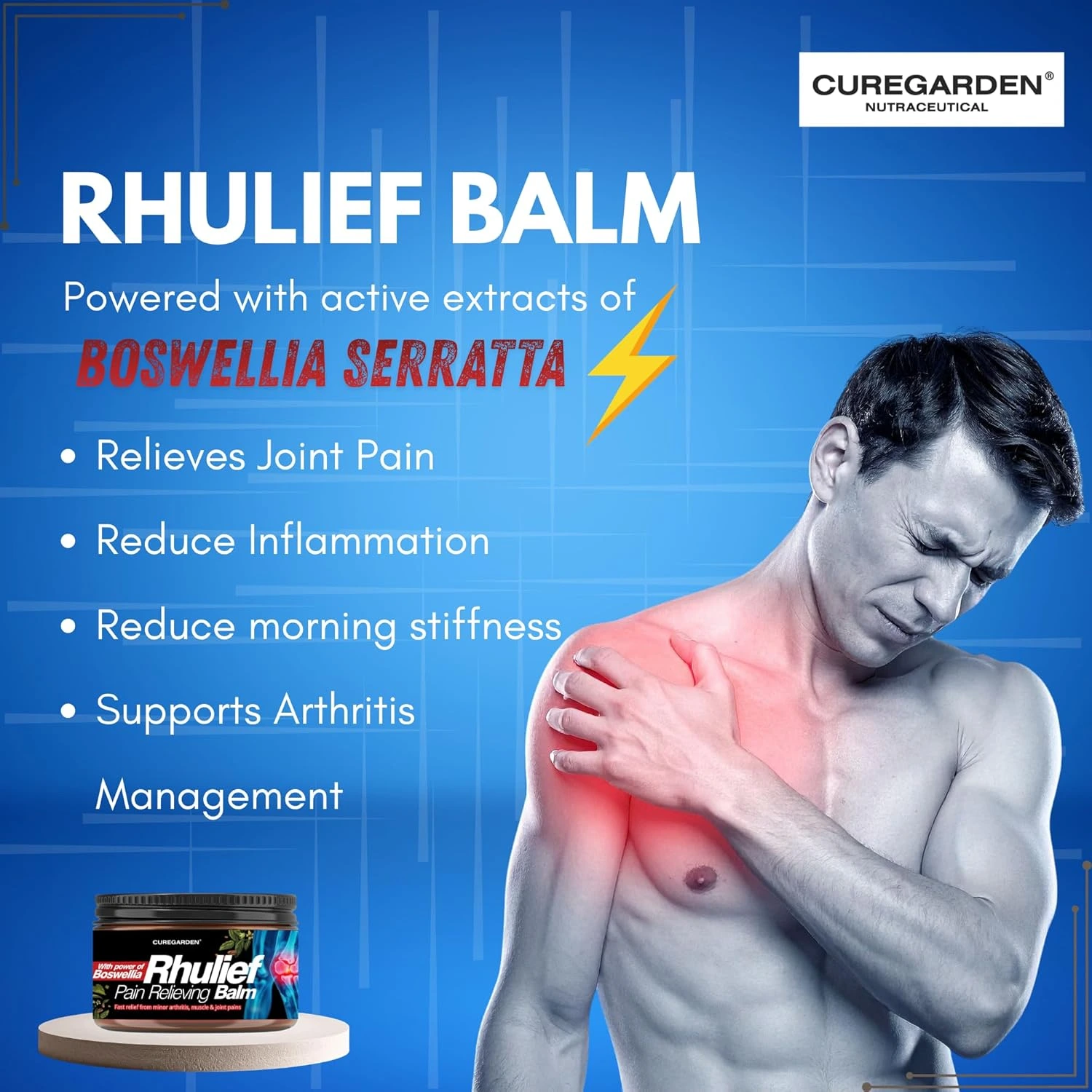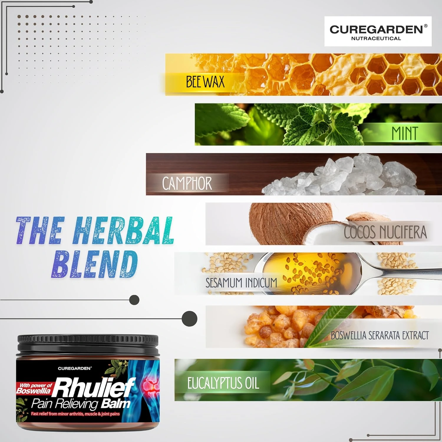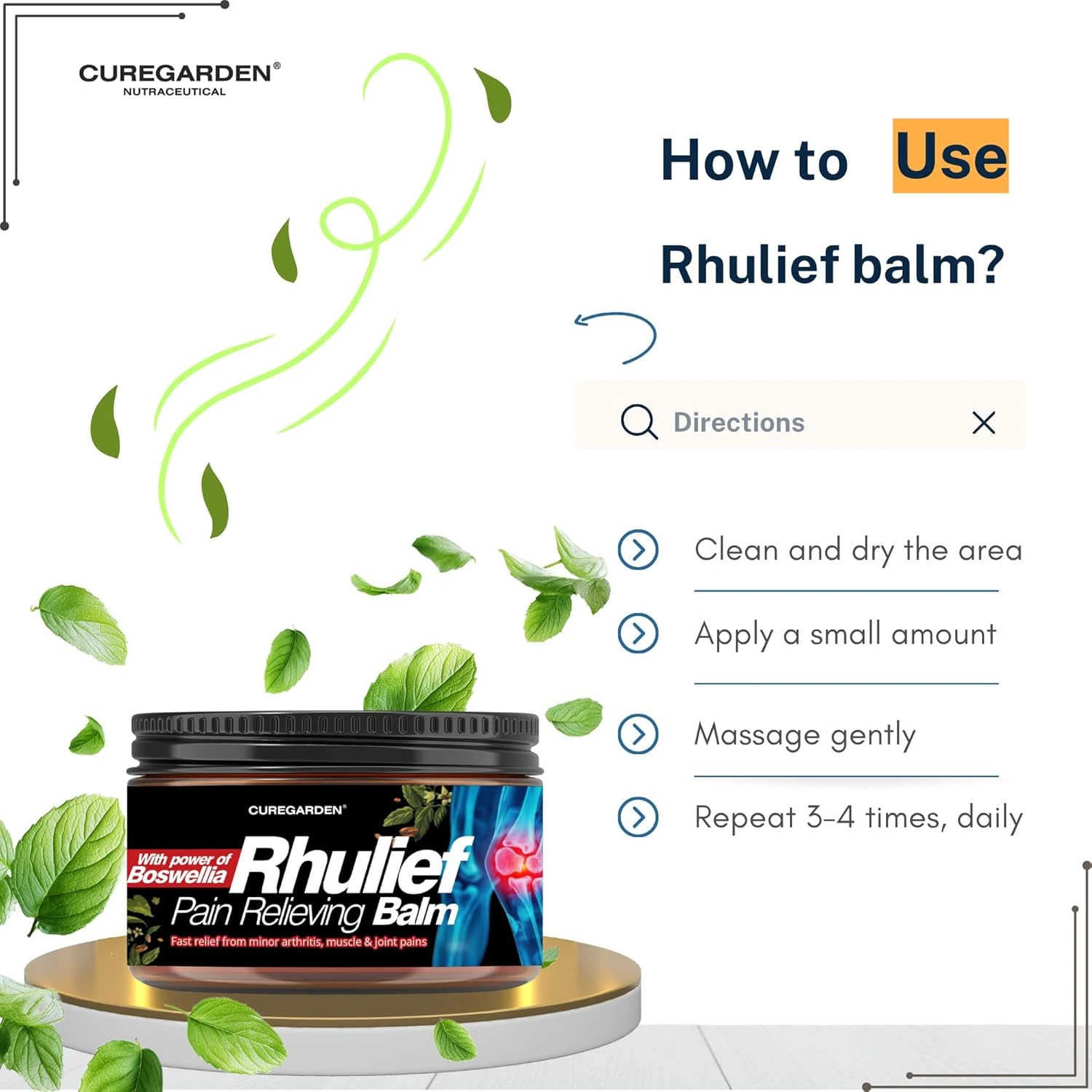 Natural Healing Powers: Experience nature’s therapeutic touch with Curegarden Rhulief Balm. No synthetic ingredients, just pure botanical extracts working harmoniously to alleviate joint and muscle pain. Enjoy peace of mind and body as you massage this balm gently into affected areas, experiencing not just relief but a holistic sense of well-being.